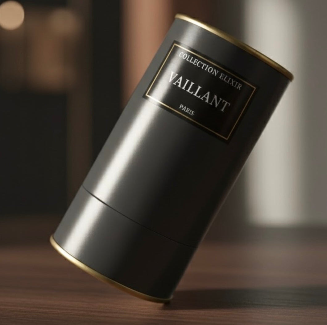 Portant fièrement l'inscription "VAILLANT" sous la mention "COLLECTION ÉLIXIR" et "PARIS", cet emballage suggère un produit de haute parfumerie ou un spiritueux d'exception. Son design épuré et puissant, dénué de genre, vise une clientèle mixte (unisexe) : il capture l'audace et la force, pour toutes celles et ceux qui affirment leur caractère.